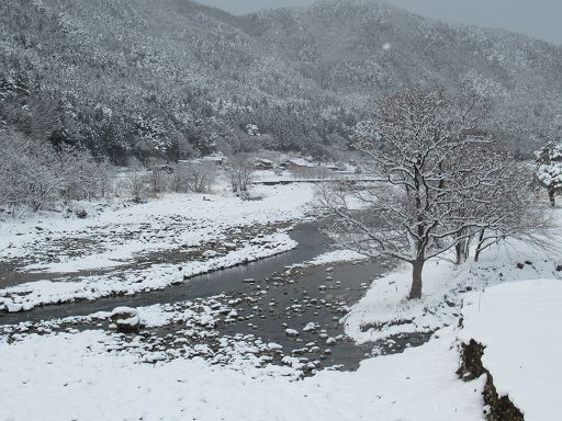 益田川沿いの木々に雪が積もり、墨絵のような光景が広がっています。