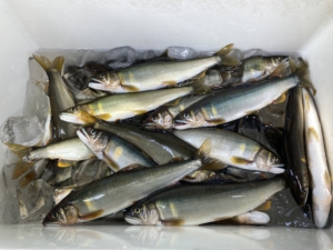 型は15センチ~18センチほどです。渚はまだ小さめとのこと。場所ムラがあるようです。川は雨が降らず渇水の状態が続いております。