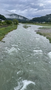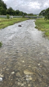 昨日はよく降り、1m以上水位の上がった本流ですが、今朝50㎝高まで下がってきています。少し濁りがあります。