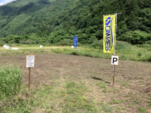 駐車場ですが、川のそばに臨時駐車場を2箇所整備しております。川沿いの管理道路への駐車はおやめください。また、地元住民の妨げになる場所への駐車はご遠慮ください。