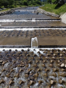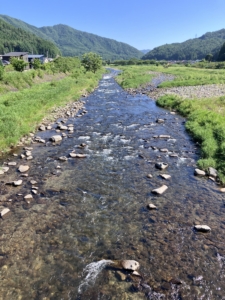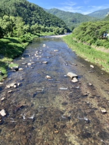 秋神川、10時現在 気温30℃、水温16℃、5㎝減水