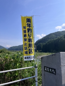 今年度は、周年友釣り専用区(年間網禁止区間)を2箇所設けました。(黄色の旗の区間)